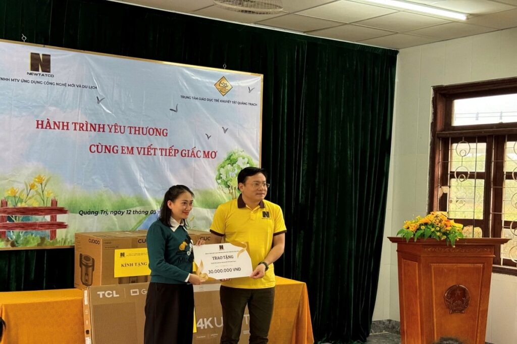 Tại đây, Ban Lãnh đạo Công ty đã thăm hỏi, động viên Tập thể các thầy cô giáo và các em học sinh với mong muốn góp phần hỗ trợ, cải thiện điều kiện học tập, sinh hoạt và chăm sóc cho các em học sinh của Trung tâm. Đoàn đã trao tặng 30.000.000 đồng, cùng các phần quà thiết thực gồm 01 tivi 55 inch, 02 nồi cơm điện công nghiệp và 250 kg gạo.